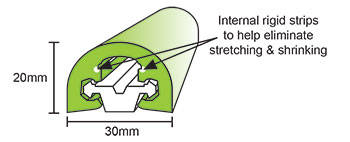 Für alle 30-mm-Ladenbauprofile (Körper) verwenden die gleiche 30/RT-Hart-PVC-Montageleiste (Schiene) und können mit Endkappen und Eckstücken abgeschlossen werden.